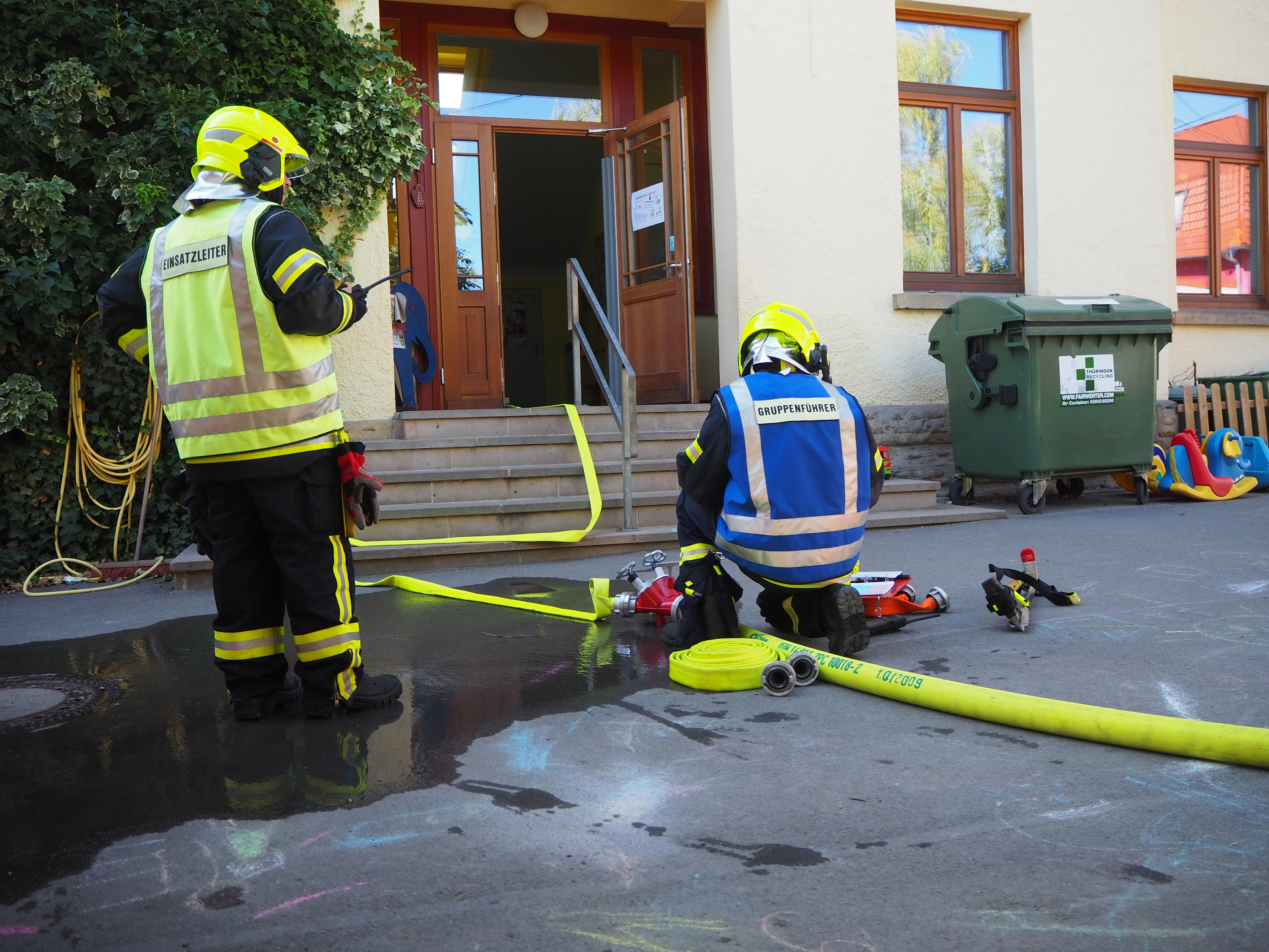 Am 23. August fand die diesjährige Einsatz- und Evakuierungsübung im Tüttleber Kindergarten statt. Die Kameradinnen und Kameraden legten eine Wasserstrecke aus der Backhausstraße zum Kindergarten am Anger, was vorbildlich und zügig gelang. Währenddessen machten sich die Atemschutzgeräteträger des Angriffstrupps daran, noch im Objekt befindliche Personen zu bergen und den Brandherd ausfindig zu machen und zu bekämpfen.Die Kameraden der Gothaer Berufsfeuerwehr hatten ihre Drehleiter mitgebracht. Unter den staunenden Augen der anwesenden Kinder, Eltern und Erzieher zeigten sie eindrucksvoll, wie diese eingesetzt wird.