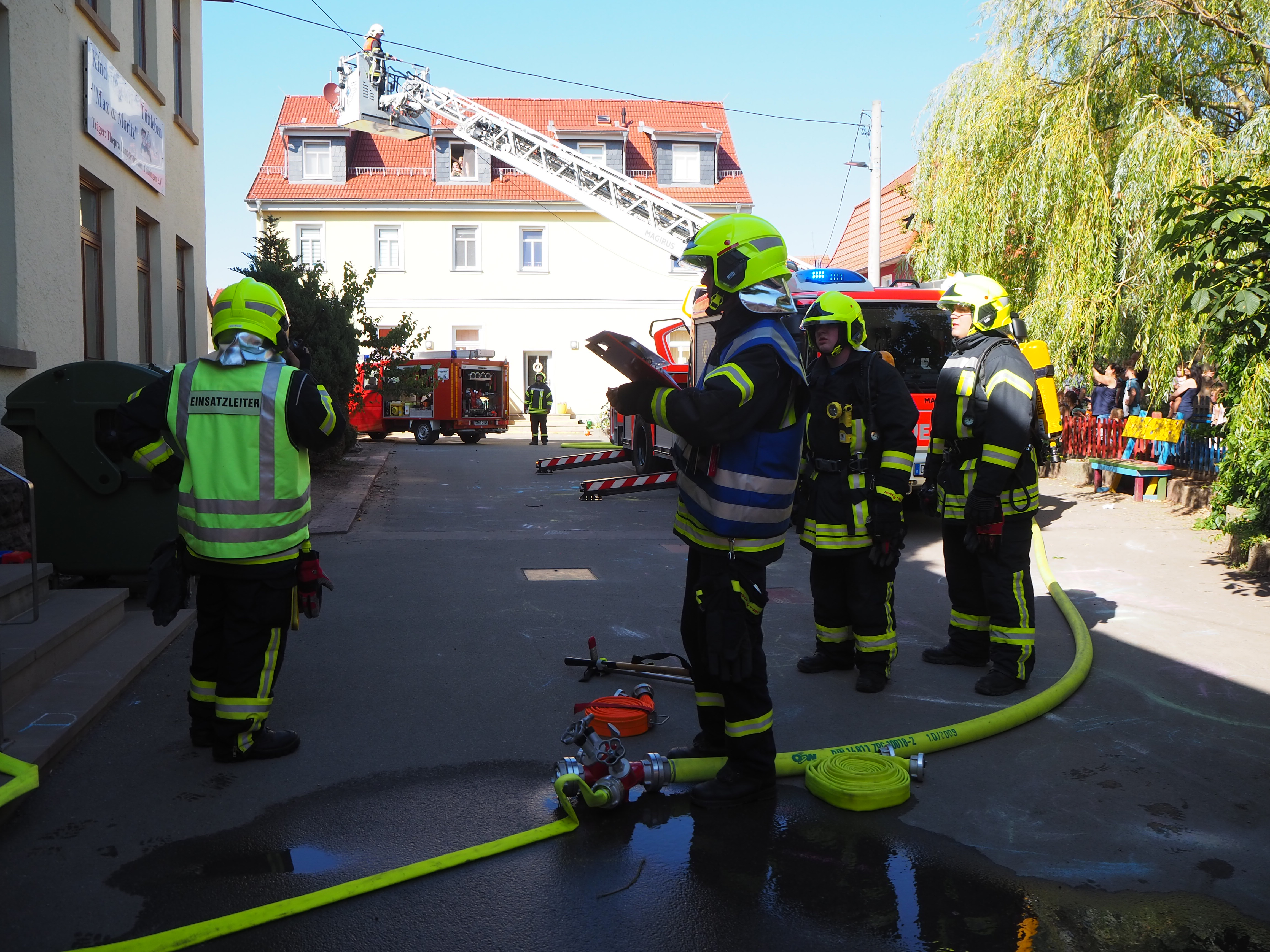 Am 23. August fand die diesjährige Einsatz- und Evakuierungsübung im Tüttleber Kindergarten statt. Die Kameradinnen und Kameraden legten eine Wasserstrecke aus der Backhausstraße zum Kindergarten am Anger, was vorbildlich und zügig gelang. Währenddessen machten sich die Atemschutzgeräteträger des Angriffstrupps daran, noch im Objekt befindliche Personen zu bergen und den Brandherd ausfindig zu machen und zu bekämpfen.Die Kameraden der Gothaer Berufsfeuerwehr hatten ihre Drehleiter mitgebracht. Unter den staunenden Augen der anwesenden Kinder, Eltern und Erzieher zeigten sie eindrucksvoll, wie diese eingesetzt wird.