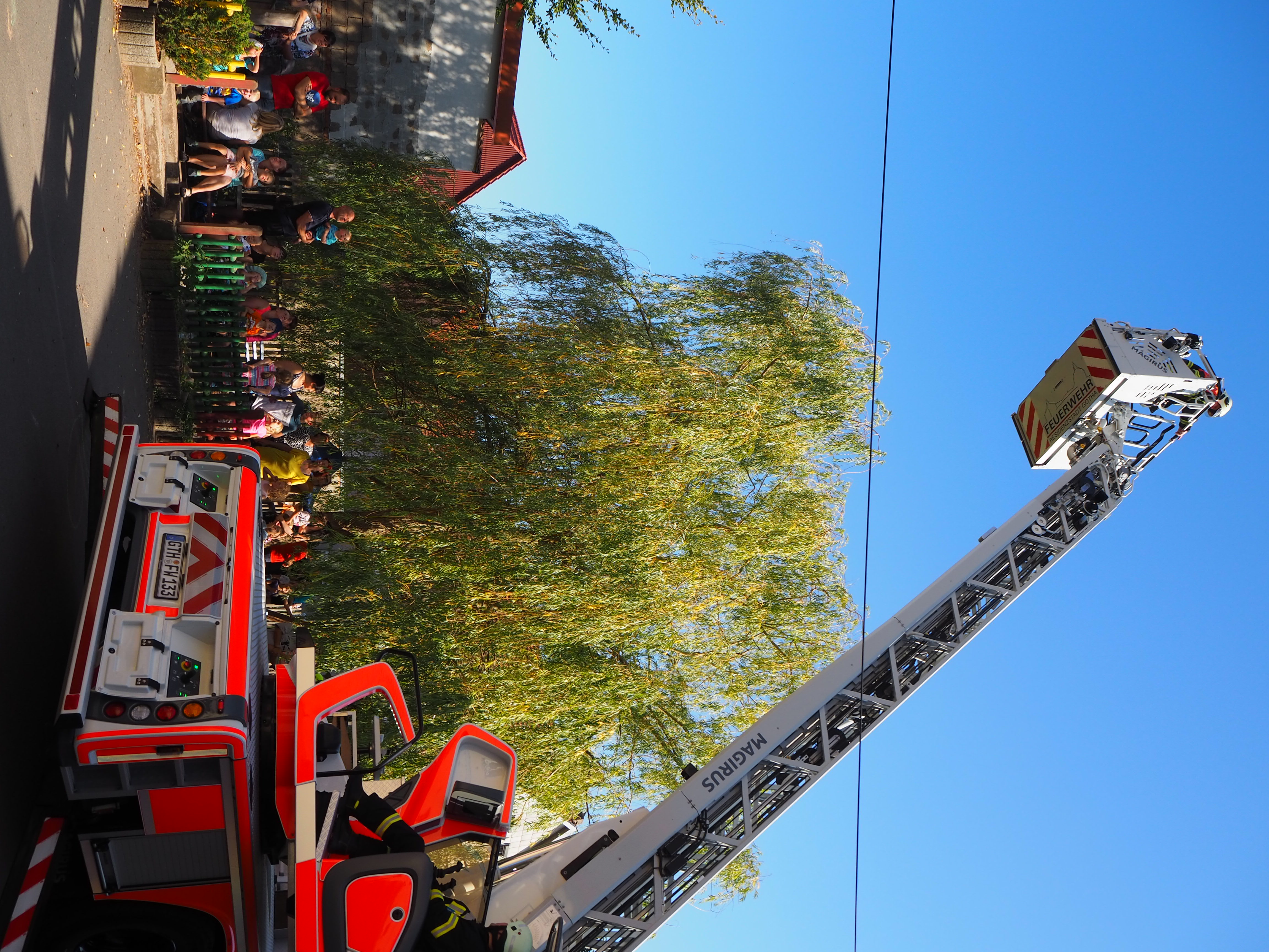 Auch wenn wir gut vorbereitet sind, so wollen wir doch hoffen, dass es nie zu einem Einsatz in unserem Kindergarten kommen wird! Das Fahrzeug der Gothaer Berufsfeuerwehr, auf welches die Drehleiter montiert ist, konnte auf den Hof fahren, dies war jedoch Millimeterarbeit. Daher an dieser Stelle noch einmal ein Appell an alle Eltern und Erzieher, die vielleicht doch einmal aus Zeitgründen direkt vor dem Hof des Kindergartens parken: dies ist eine Feuerwehrzufahrt und sollte deshalb unbedingt zu jeder Zeit freigehalten werden. Im Ernstfall können Minuten oder Sekunden entscheiden!