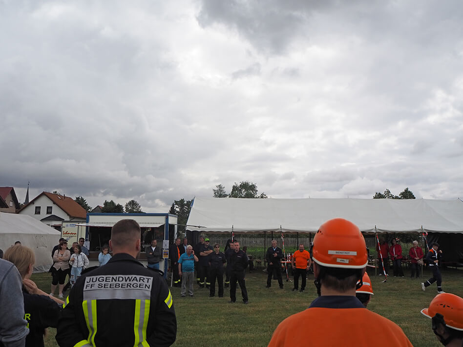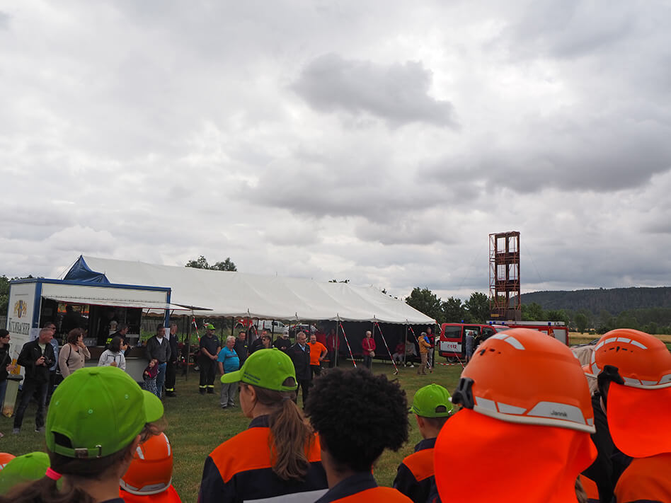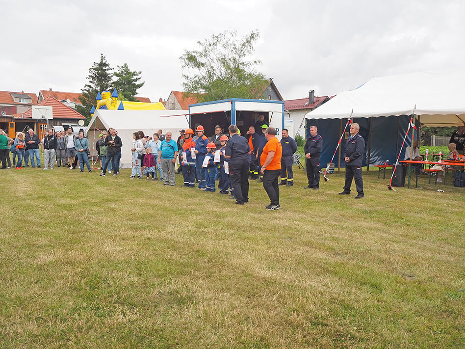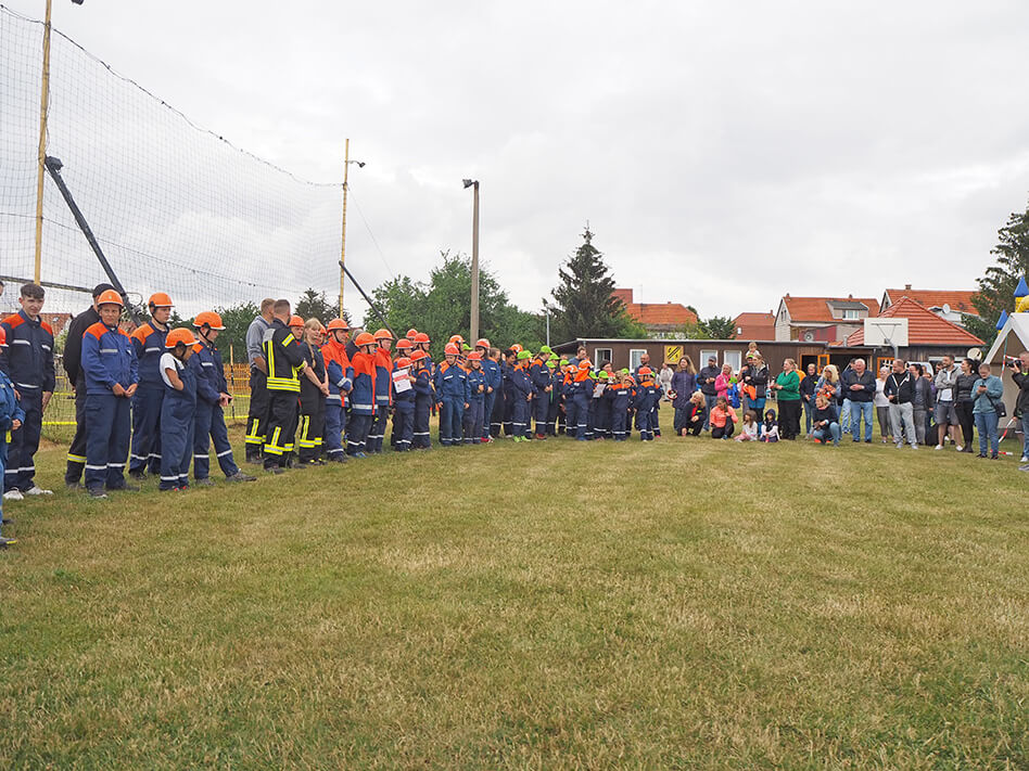 Insgesamt gingen 16 Mannschaften auf drei Wettkampfbahnen an den Start. Die Kleinsten absolvierten ihren Parcours und mussten so viel wie möglich Wasser ins Ziel bringen. Die anderen Gruppen bauten auf der Bahn einen Löschangriff auf und mussten Ziele abschießen oder füllen. Die Tüttleber gingen in allen Disziplinen mit insgesamt fünf Mannschaften an den Start.